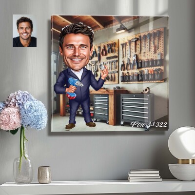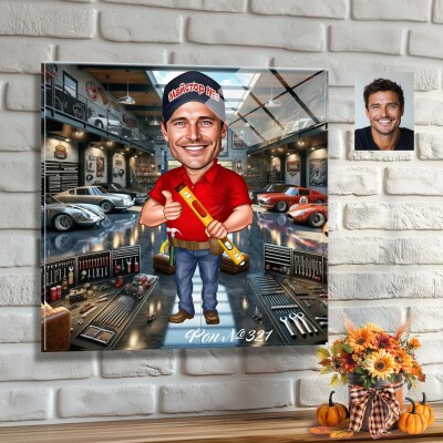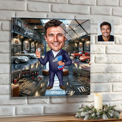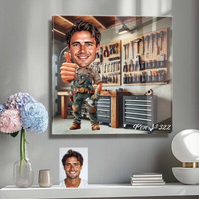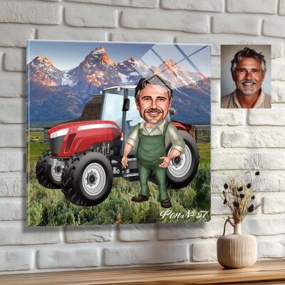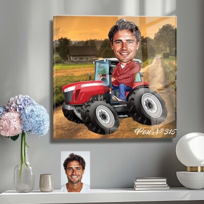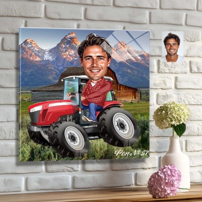 Стъклена карикатура на мъж с трактор - Млад земеделец