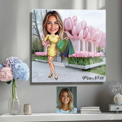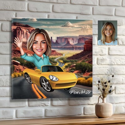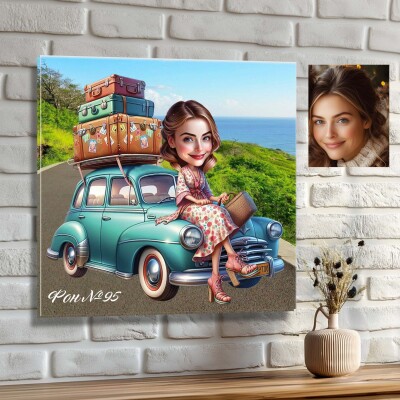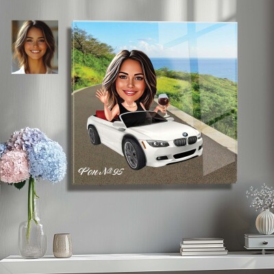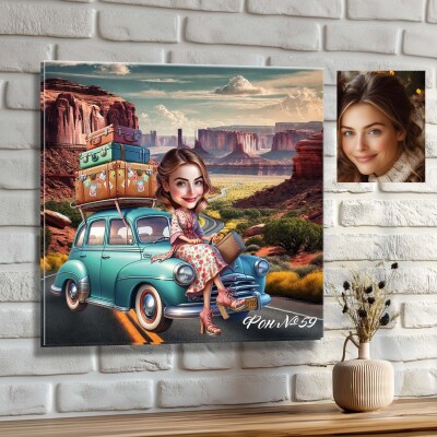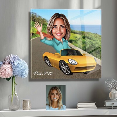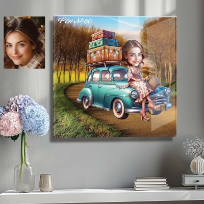 Стъклена карикатура на жена с кола и багаж - Свобода