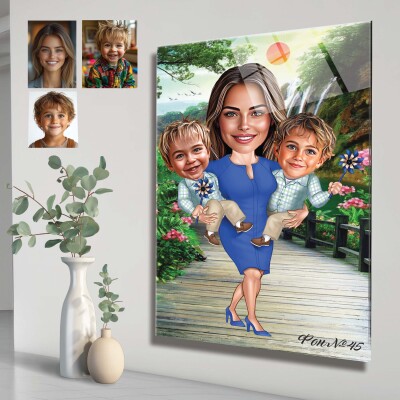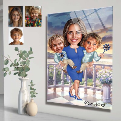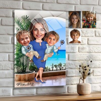 Стъклена карикатура на жена с момче и момиче