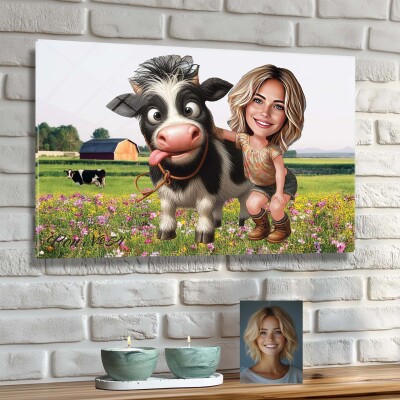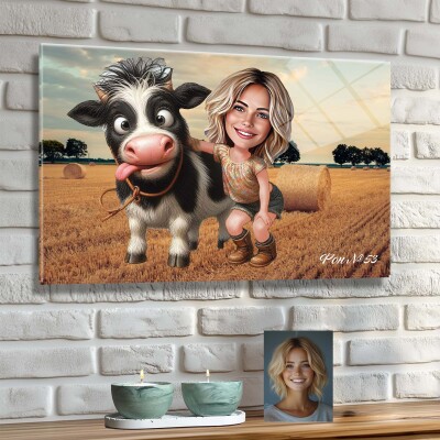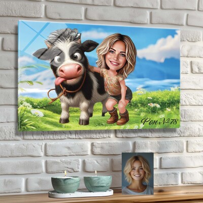 Стъклена карикатура на жена с крава - Селски живот