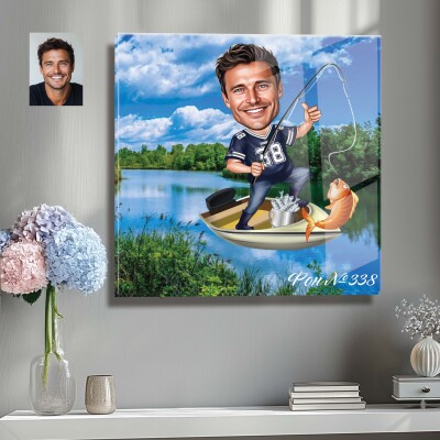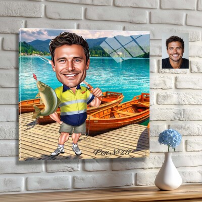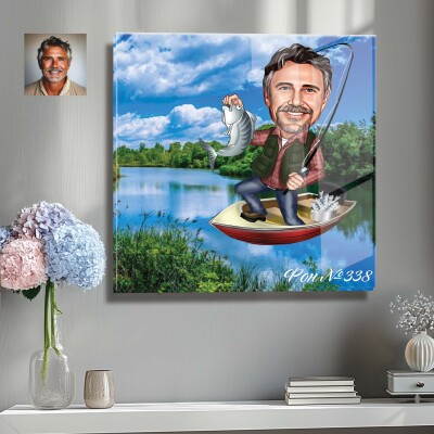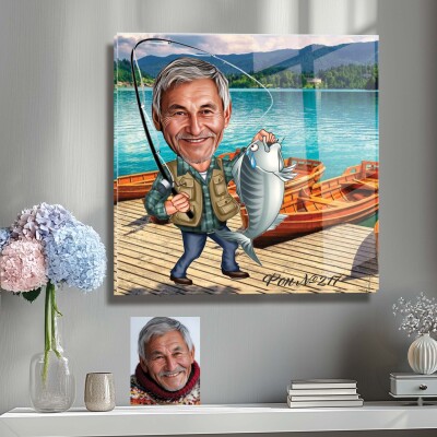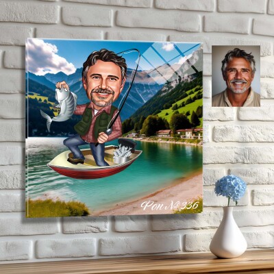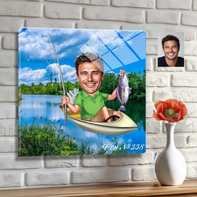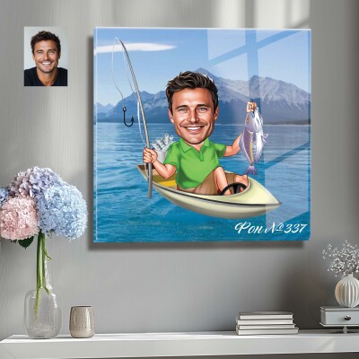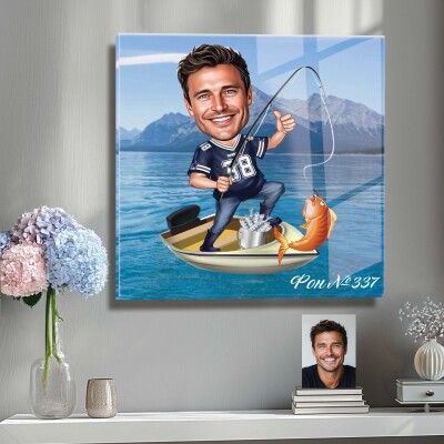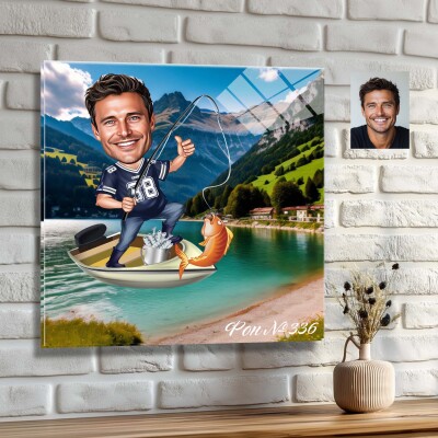 Стъклена карикатура на мъж - рибар с риба и лодка