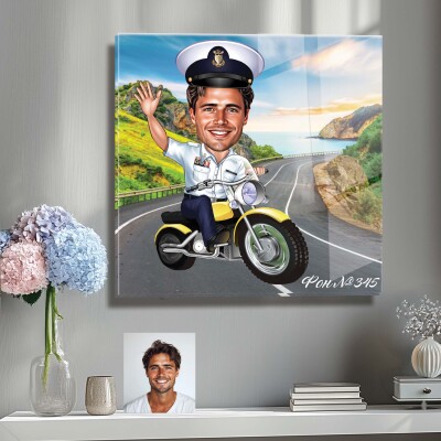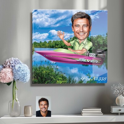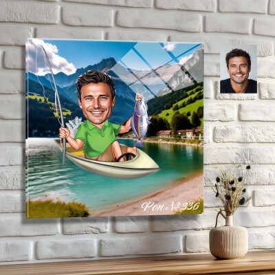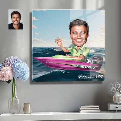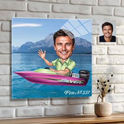 Стъклена карикатура на мъж с моторна лодка