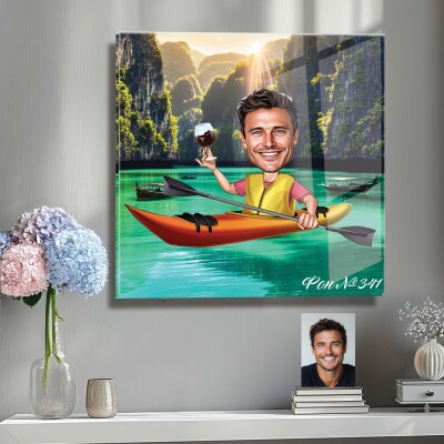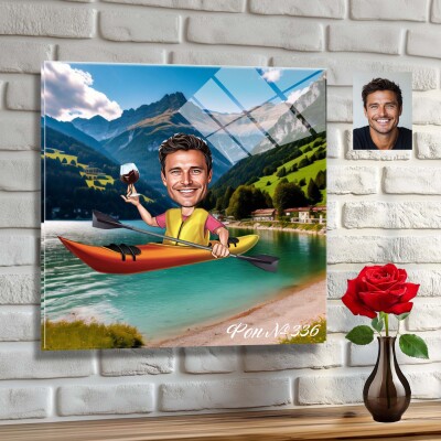 Стъклена карикатура на мъж с каяк и вино