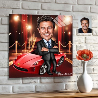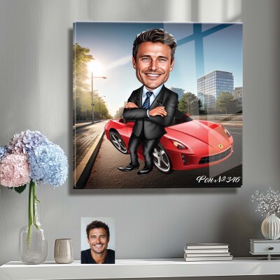 Стъклена карикатура на мъж с кола - червено Ферари