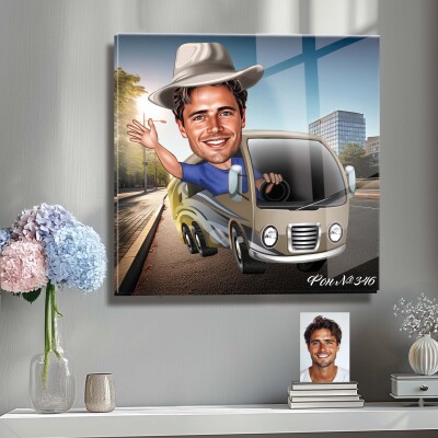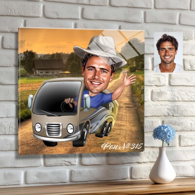 Стъклена карикатура на мъж с кемпер - бус