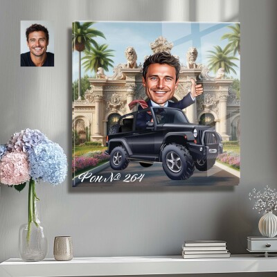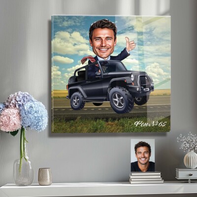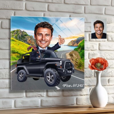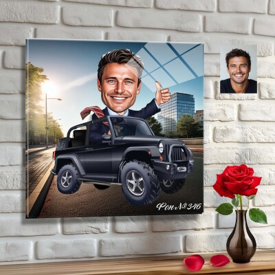 Стъклена карикатура на мъж - шеф с джип