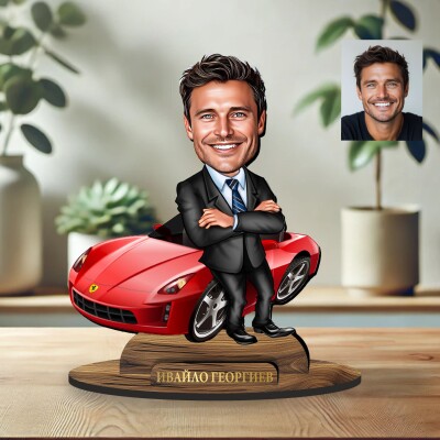 3Д дървен плакет - Карикатура Мъж с червена кола