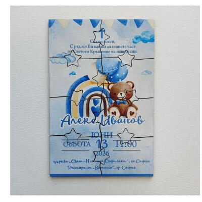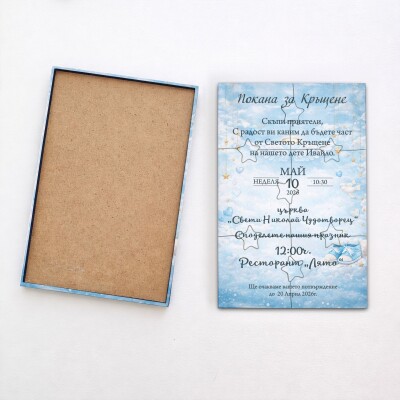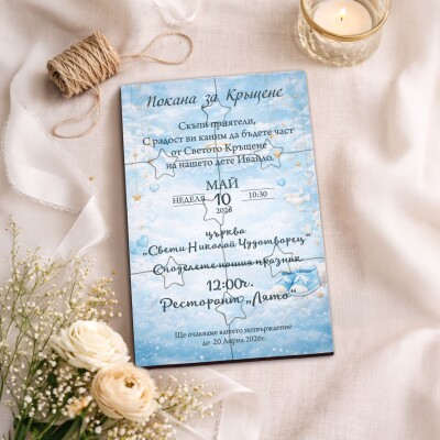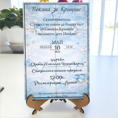Дървена покана тип пъзел за кръщене 007