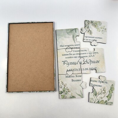 Дървена покана тип пъзел за сватба 004