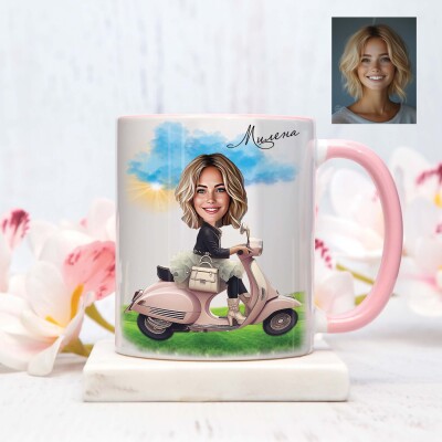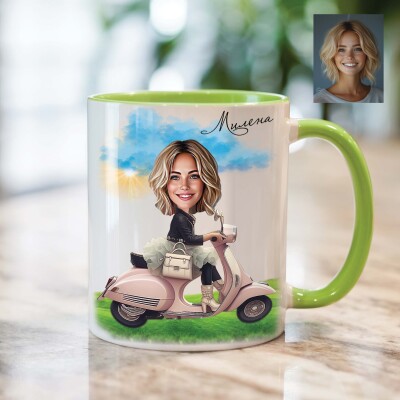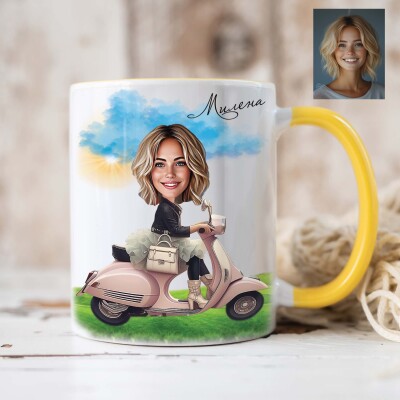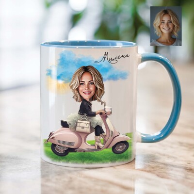 Чаша с карикатура на жена с мотопед - скутер
