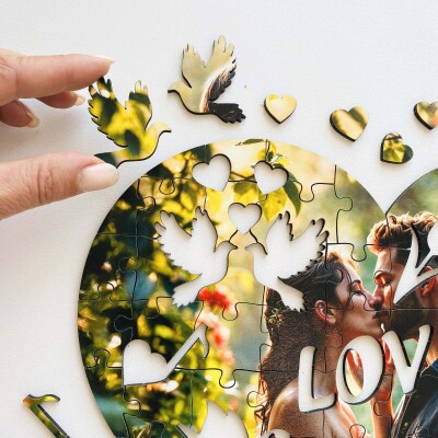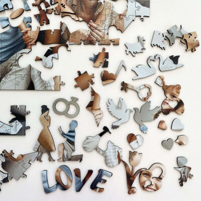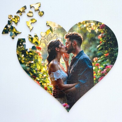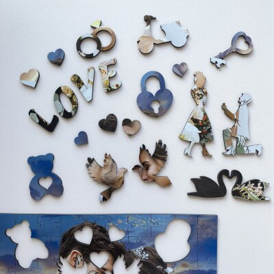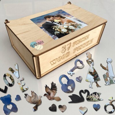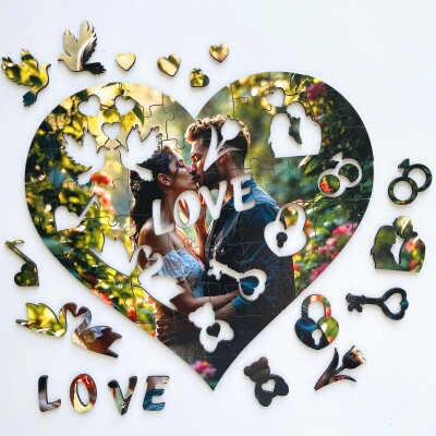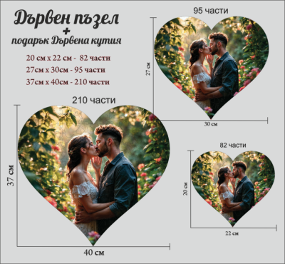 Дървен пъзел сърце по Ваша снимка с фигурни части + подарък дървена кутия