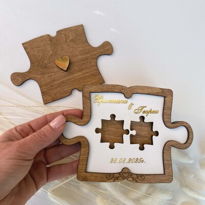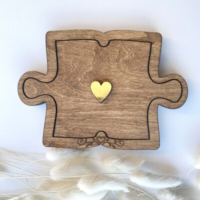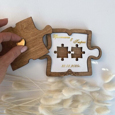 Дървена кутия за сватбени пръстени с персонализация - Пъзел