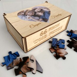 Дървен пъзел сърце по Ваша снимка с фигурни части + подарък дървена кутия