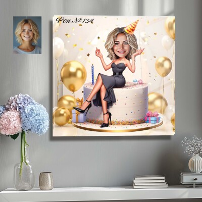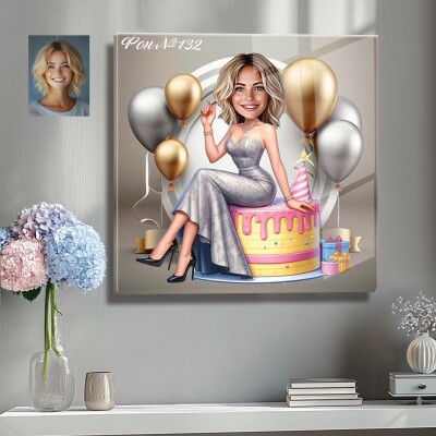 Стъклена карикатура на жена с торта - Честит рожден ден!
