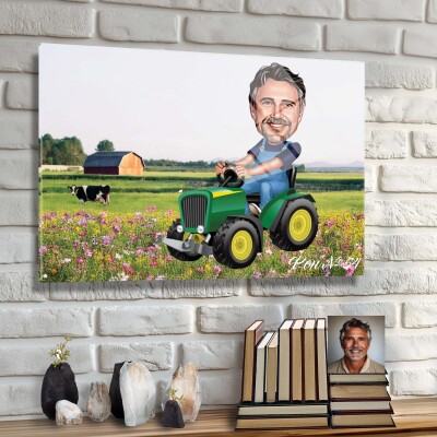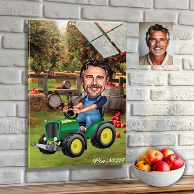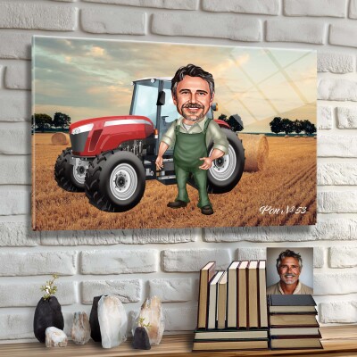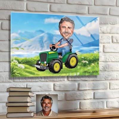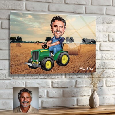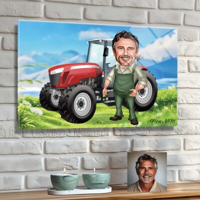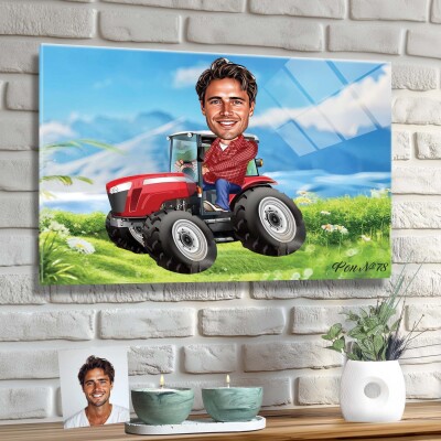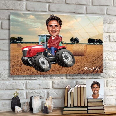Стъклена карикатура на мъж - млад земеделец с трактор