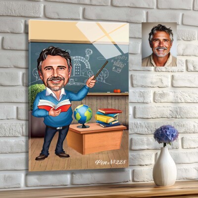 Стъклена карикатура на мъж, учител с показалка - преподавател