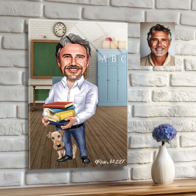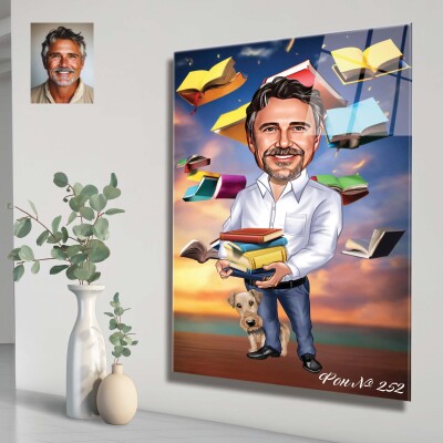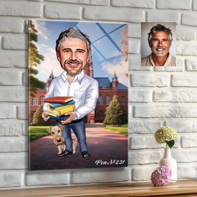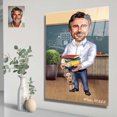 Стъклена карикатура на мъж с куче - учител, преподавател