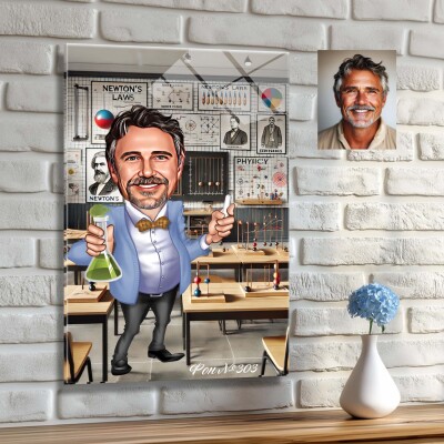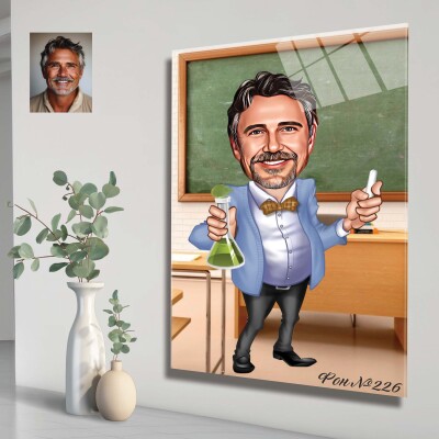 Стъклена карикатура на мъж учител - преподавател по химия