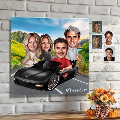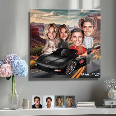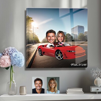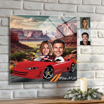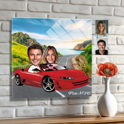 Стъклена карикатура на двойка с червена кола