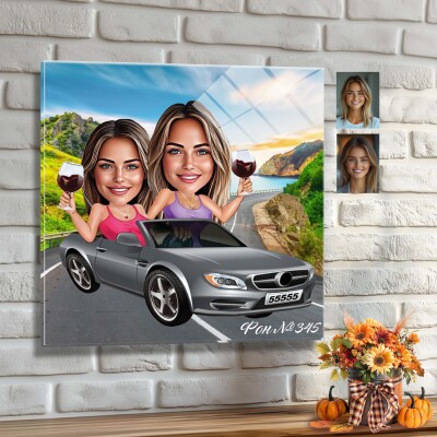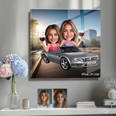 Стъклена карикатура на момичета с кола и вино