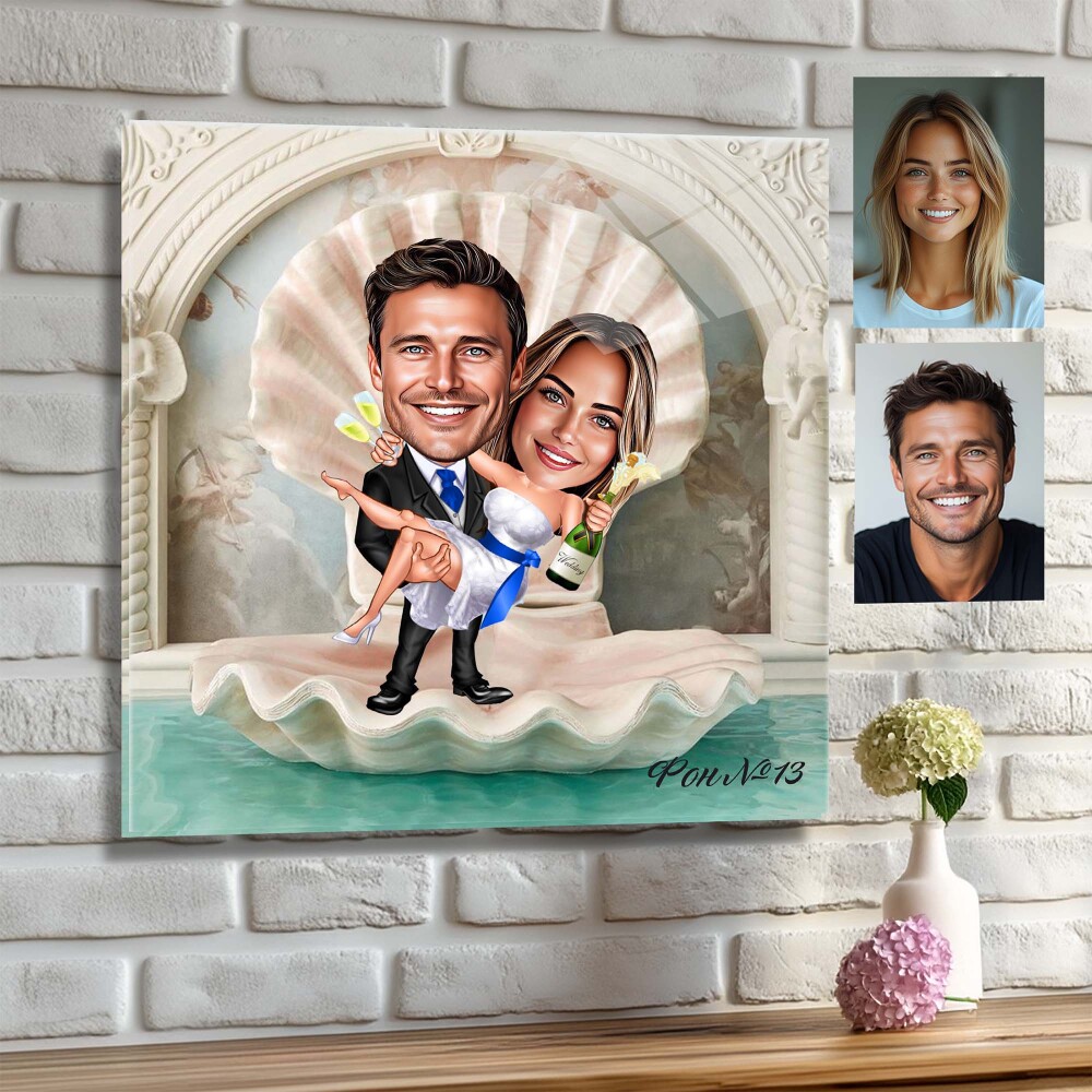 Стъклена карикатура на мъж и жена - Двойка с шампанско