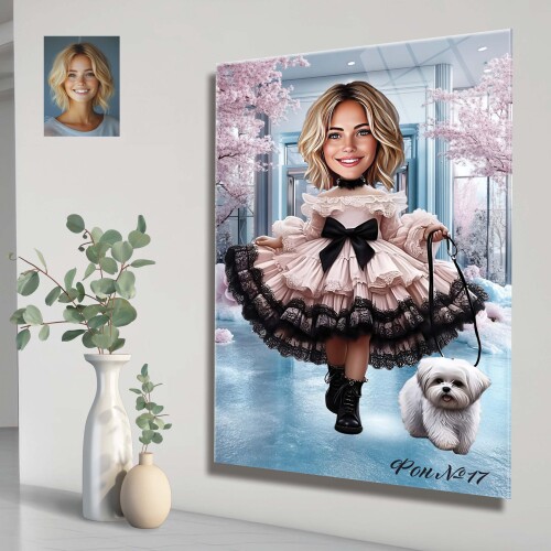 Стъклена карикатура на жена с кученце - Кокетна разходка