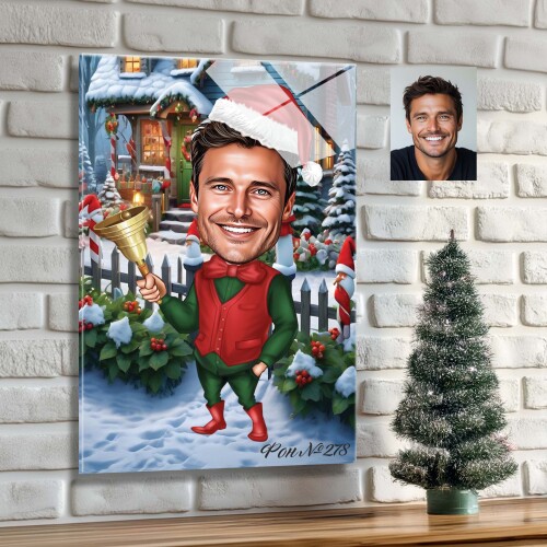 Стъклена карикатура на мъж с коледен звънец - Време за Коледа