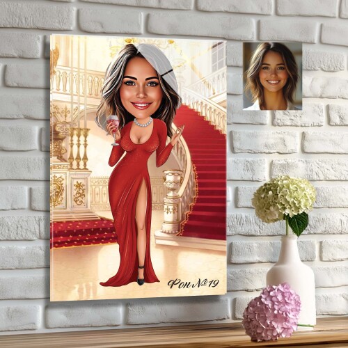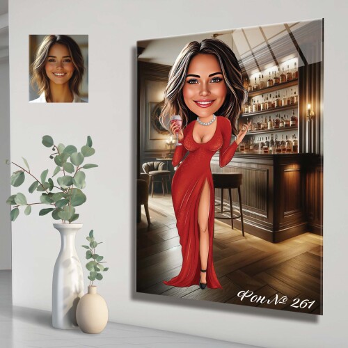 Стъклена карикатура на жена с червена коктейлна рокля