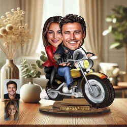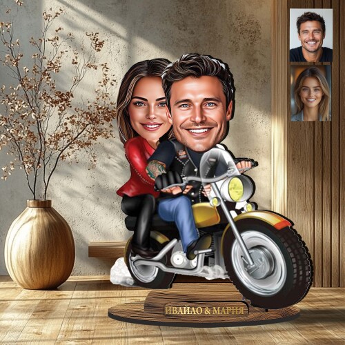 3Д дървен плакет - Карикатура на двойка с мотор