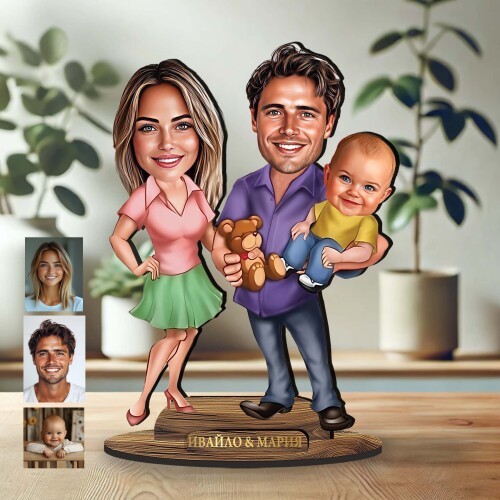 3Д дървен плакет - Карикатура на семейство с бебе (Вариант 2)