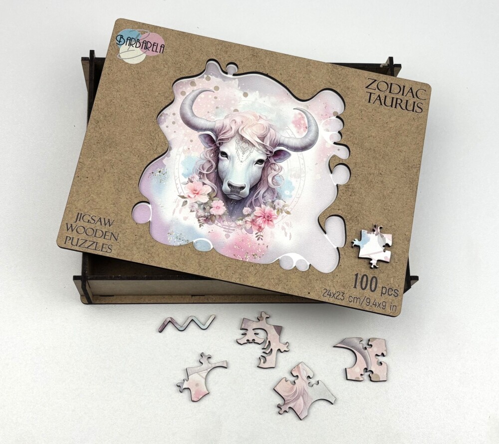 Дървен пъзел "Зодия Телец" – изрязан по контур с фигурни елементи