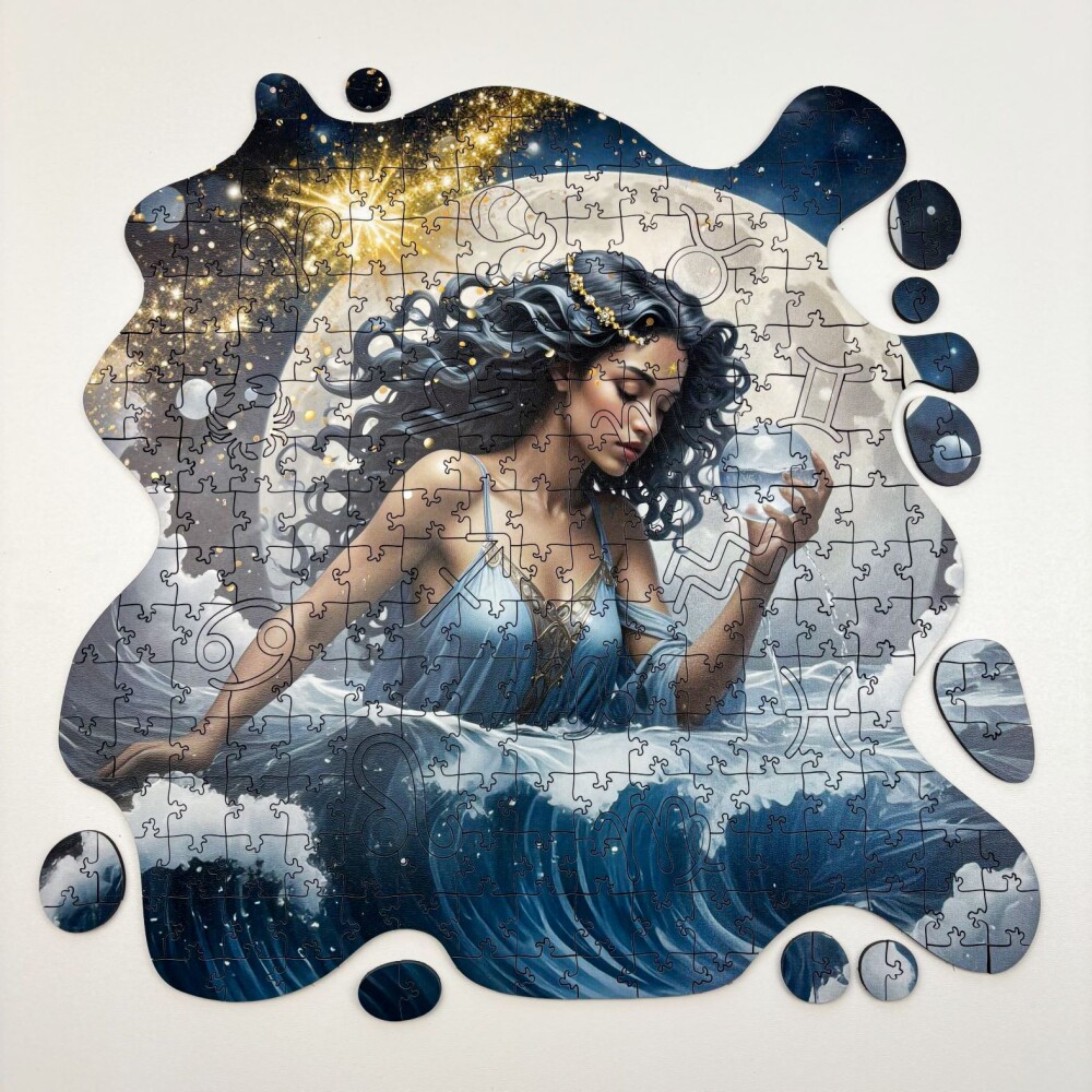 Дървен пъзел "Зодия Водолей" – изрязан по контур с фигурни елементи