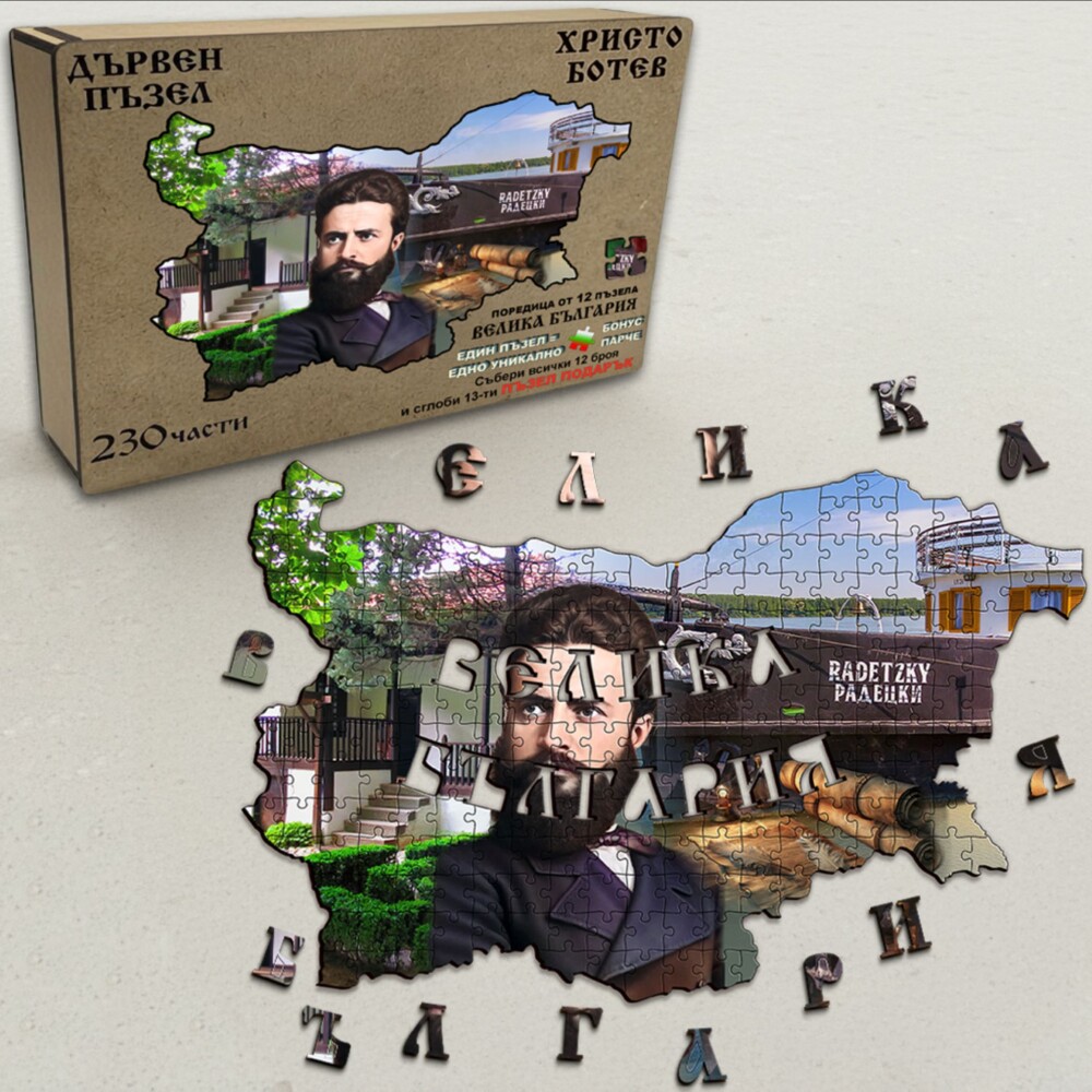 Дървен пъзел "Христо Ботев" – изрязан по външния контур на картата на България.