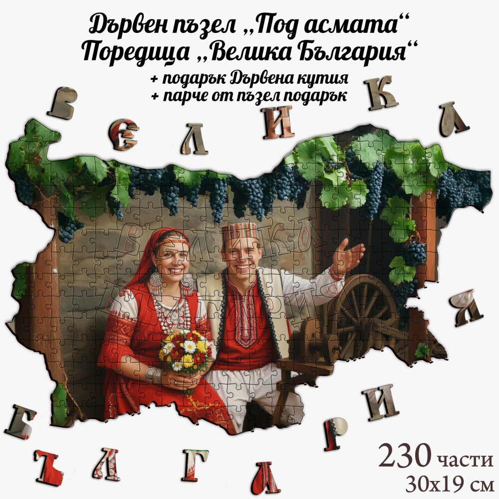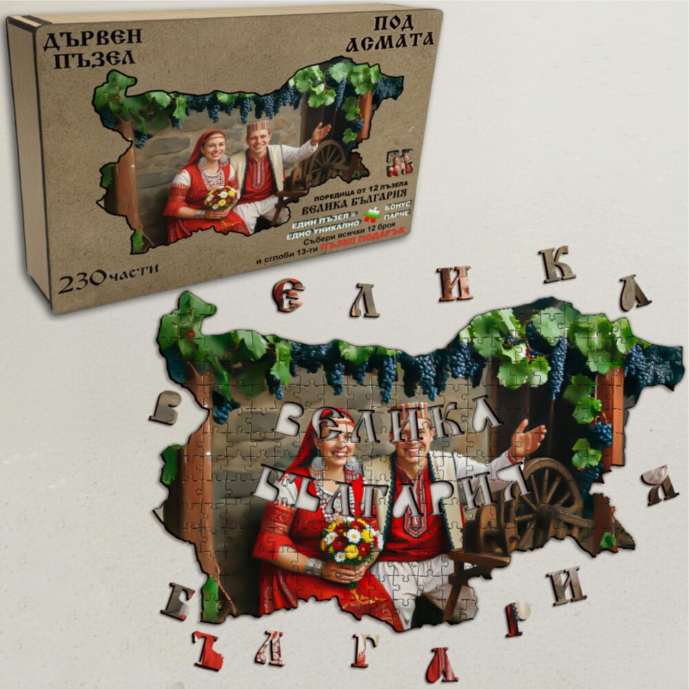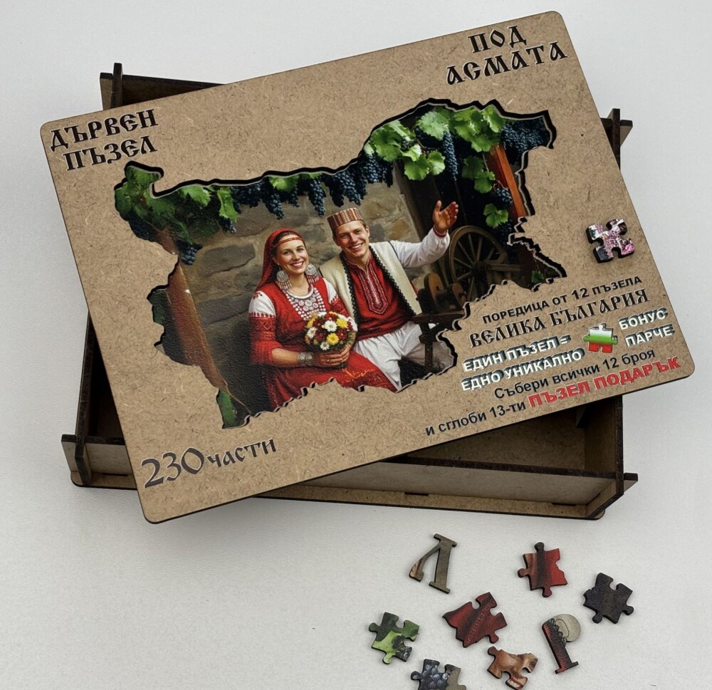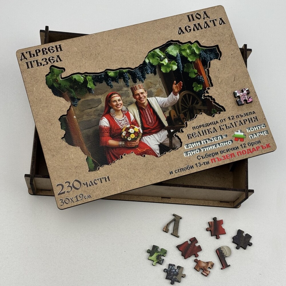 Дървен пъзел "Под асмата" – изрязан по външния контур на картата на България.