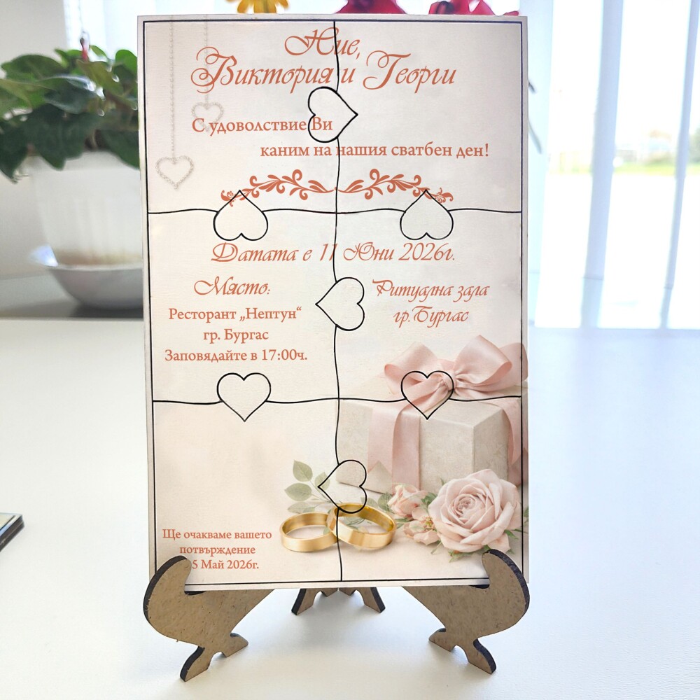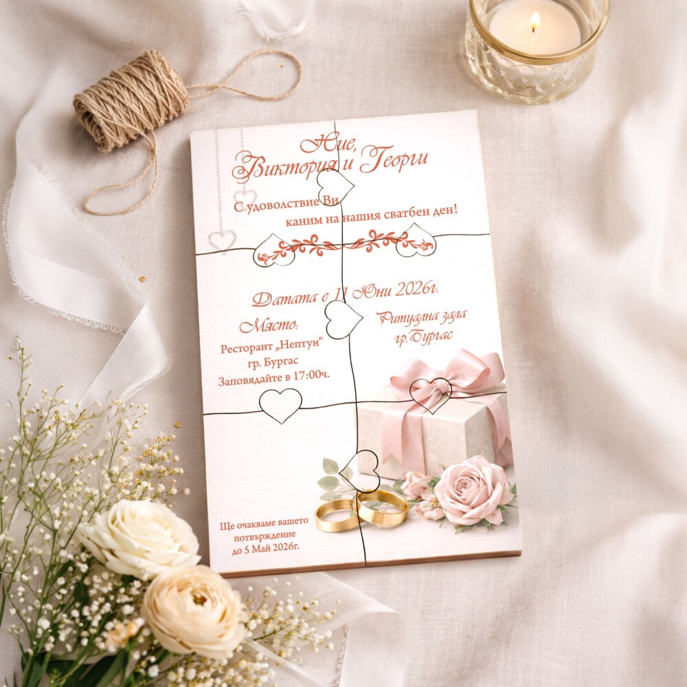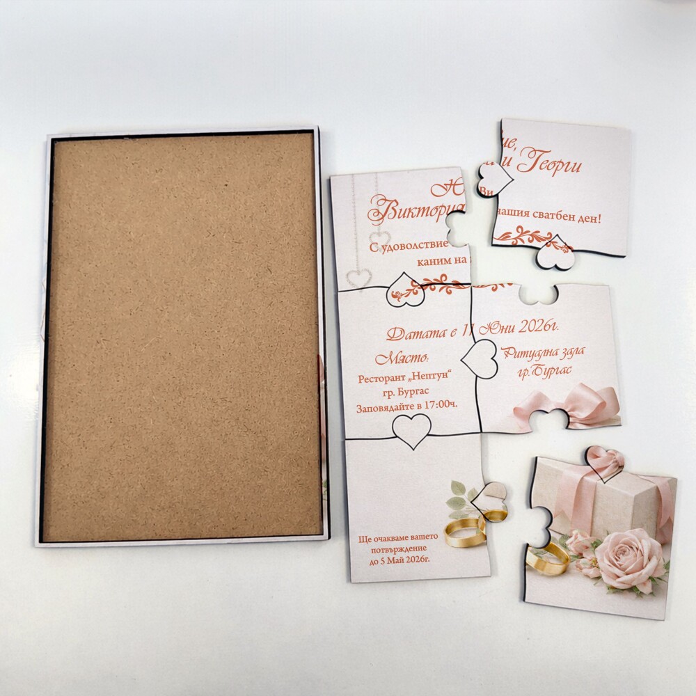 Пъзелът превръща поканата в изживяване – гостите сглобяват частите и разкриват вашето послание по уникален и запомнящ се начин.