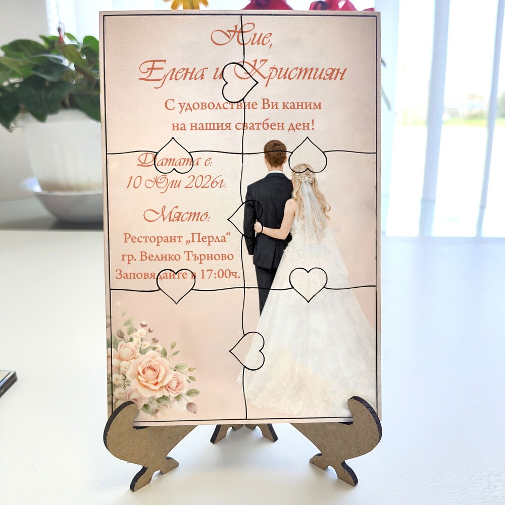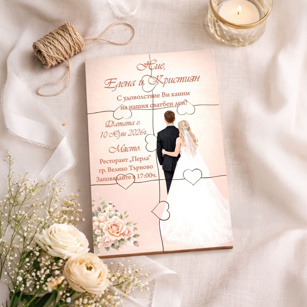 Пъзелът превръща поканата в изживяване – гостите сглобяват частите и разкриват вашето послание по уникален и запомнящ се начин.