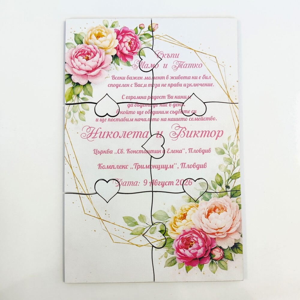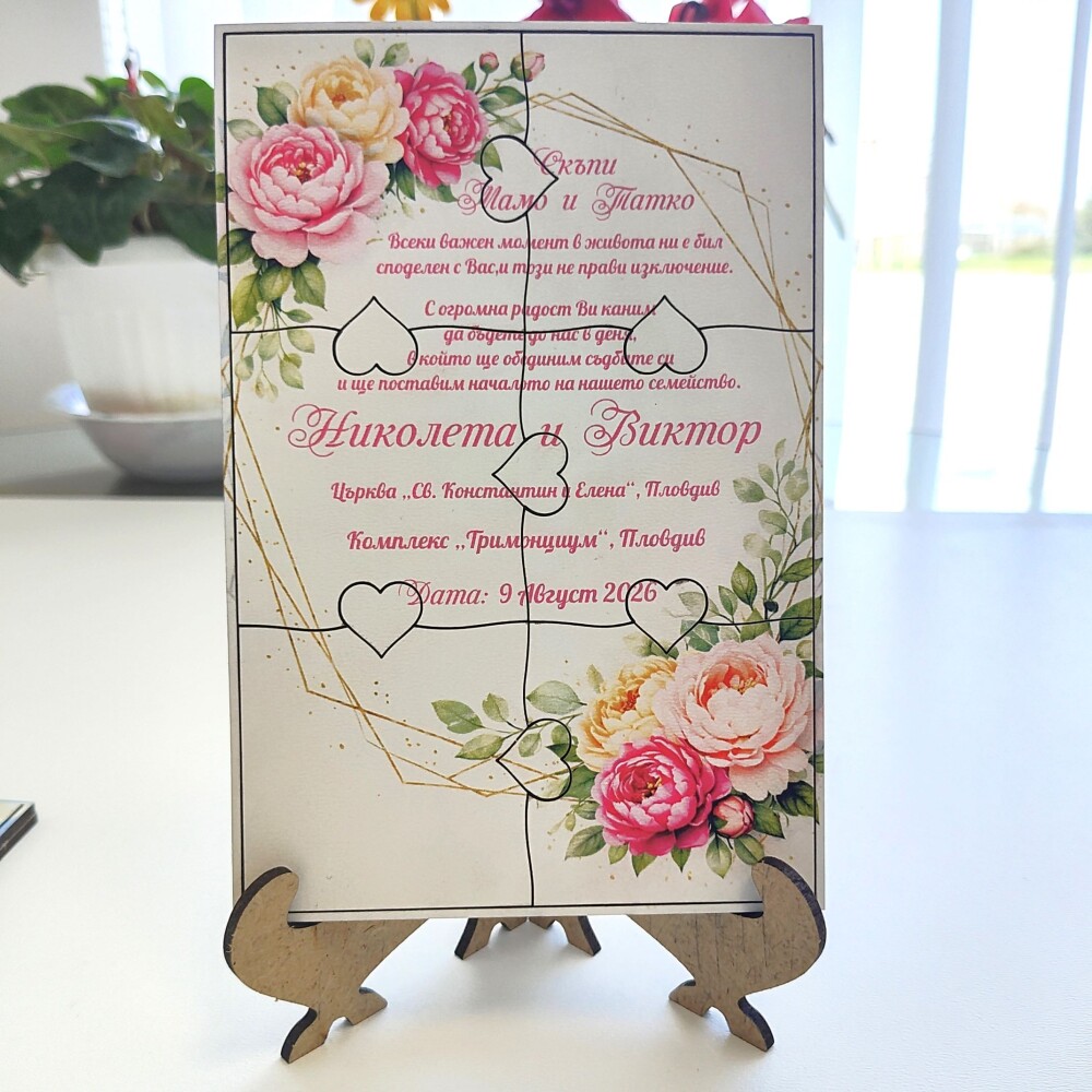 Пъзелът превръща поканата в изживяване – гостите сглобяват частите и разкриват вашето послание по уникален и запомнящ се начин.