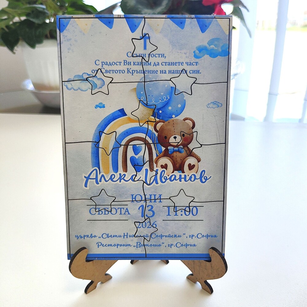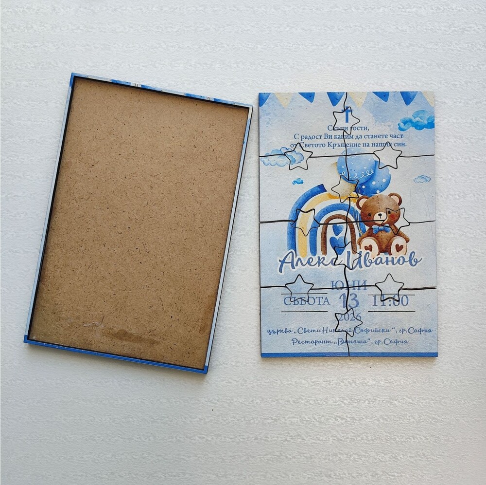 Пъзелът превръща поканата в изживяване – гостите сглобяват частите и разкриват вашето послание по уникален и запомнящ се начин.