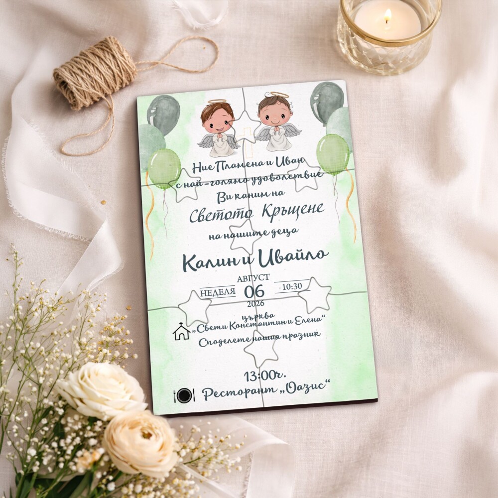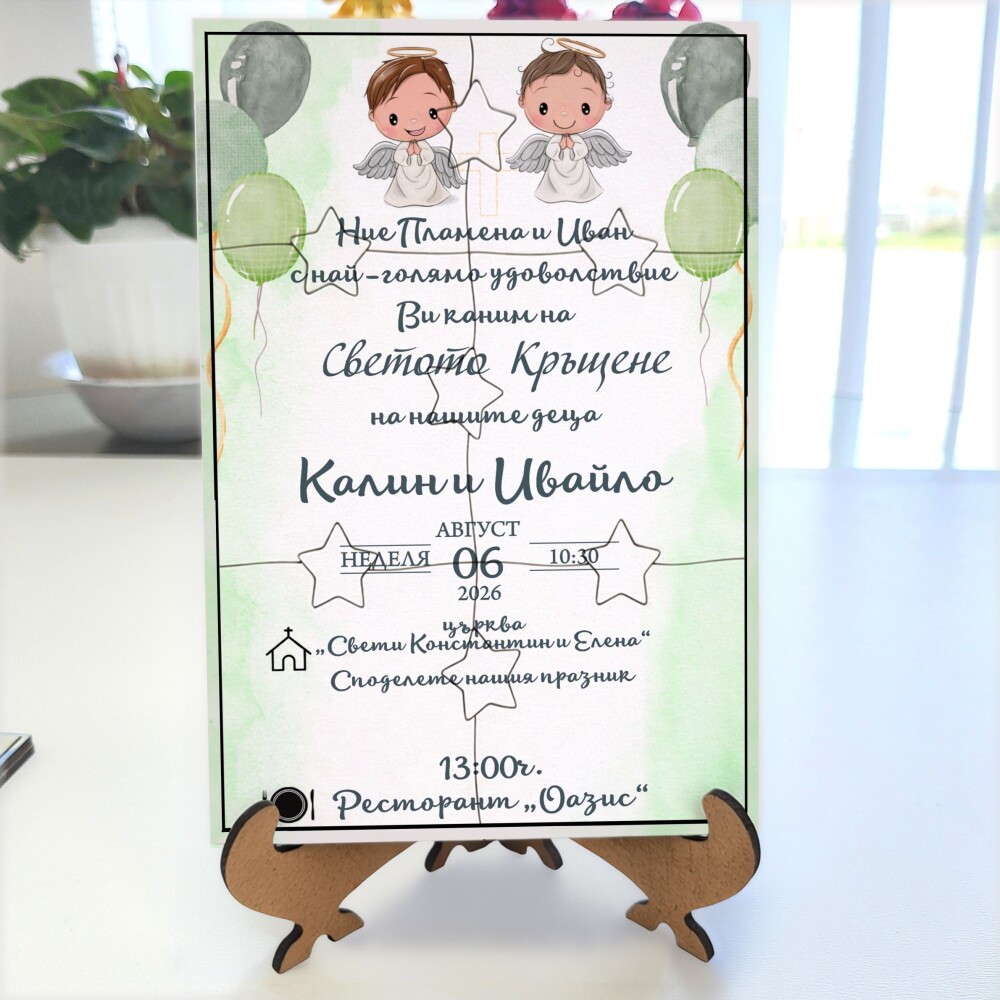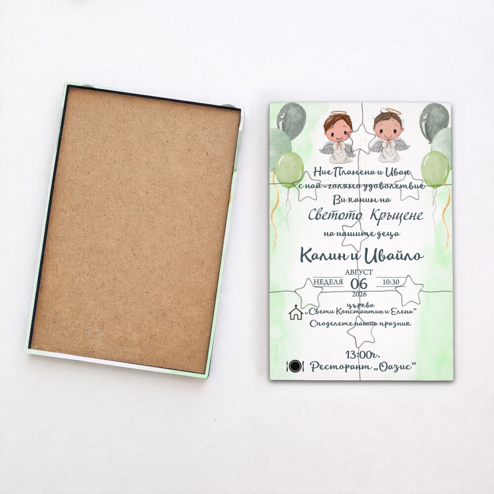 Пъзелът превръща поканата в изживяване – гостите сглобяват частите и разкриват вашето послание по уникален и запомнящ се начин.