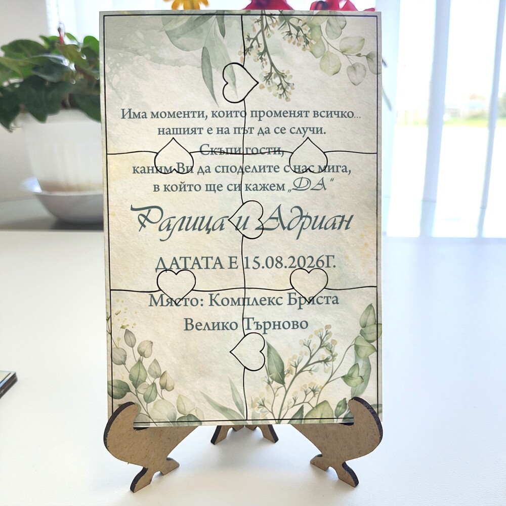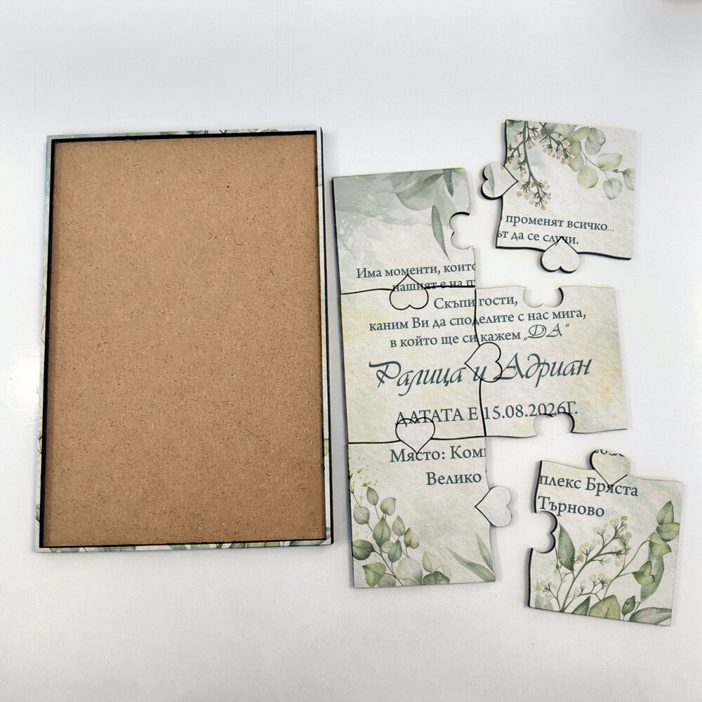 Пъзелът превръща поканата в изживяване – гостите сглобяват частите и разкриват вашето послание по уникален и запомнящ се начин.