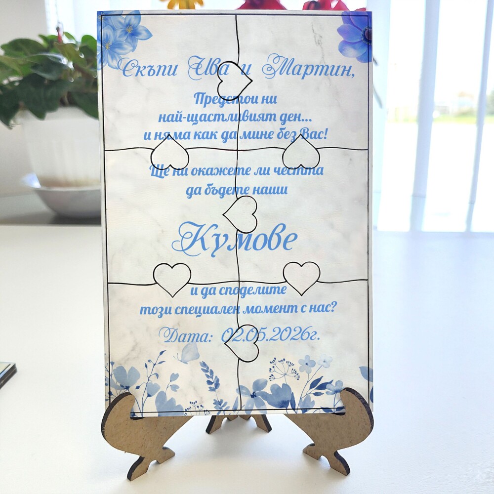 Пъзелът превръща поканата в изживяване – гостите сглобяват частите и разкриват вашето послание по уникален и запомнящ се начин.