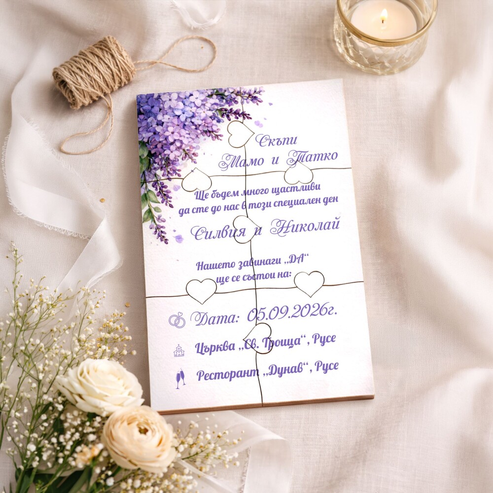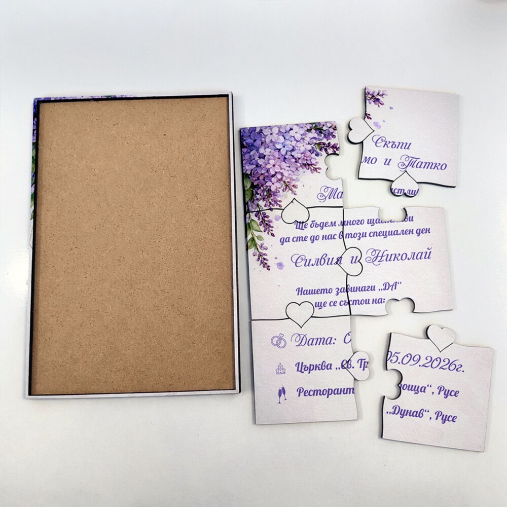 Пъзелът превръща поканата в изживяване – гостите сглобяват частите и разкриват вашето послание по уникален и запомнящ се начин.