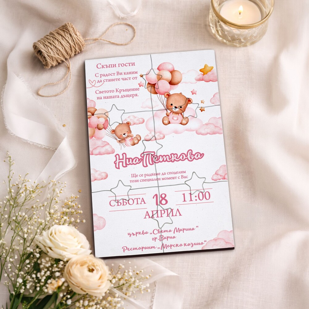 Пъзелът превръща поканата в изживяване – гостите сглобяват частите и разкриват вашето послание по уникален и запомнящ се начин.