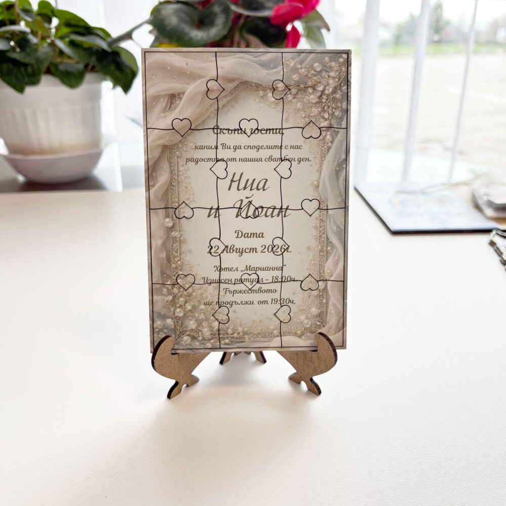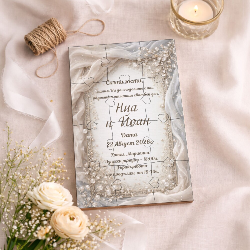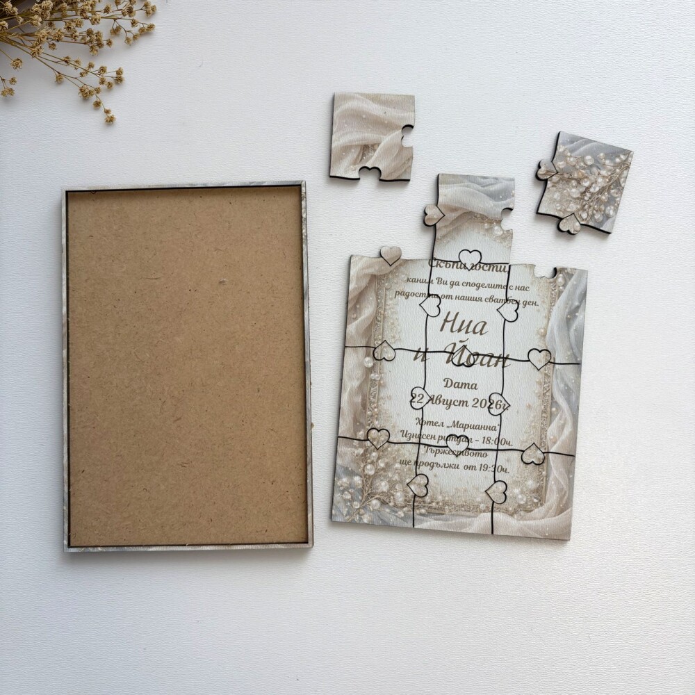 Пъзелът превръща поканата в изживяване – гостите сглобяват частите и разкриват вашето послание по уникален и запомнящ се начин.