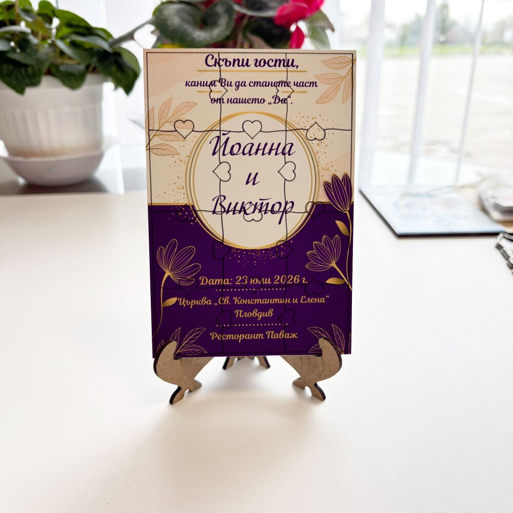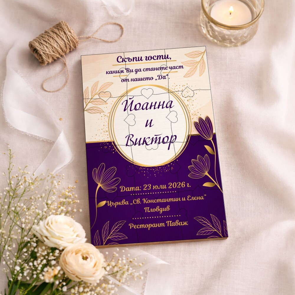 Пъзелът превръща поканата в изживяване – гостите сглобяват частите и разкриват вашето послание по уникален и запомнящ се начин.