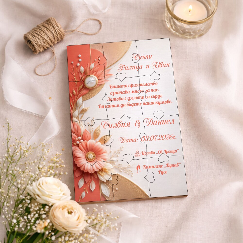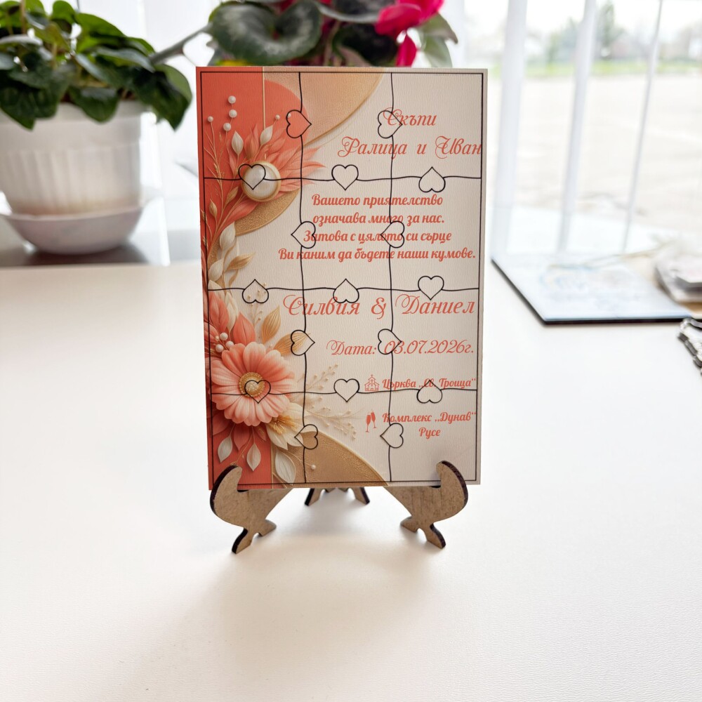 Пъзелът превръща поканата в изживяване – гостите сглобяват частите и разкриват вашето послание по уникален и запомнящ се начин.