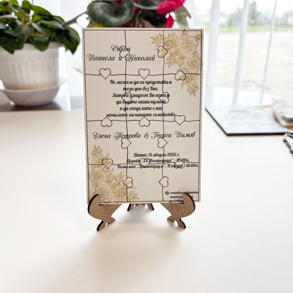 Пъзелът превръща поканата в изживяване – гостите сглобяват частите и разкриват вашето послание по уникален и запомнящ се начин.