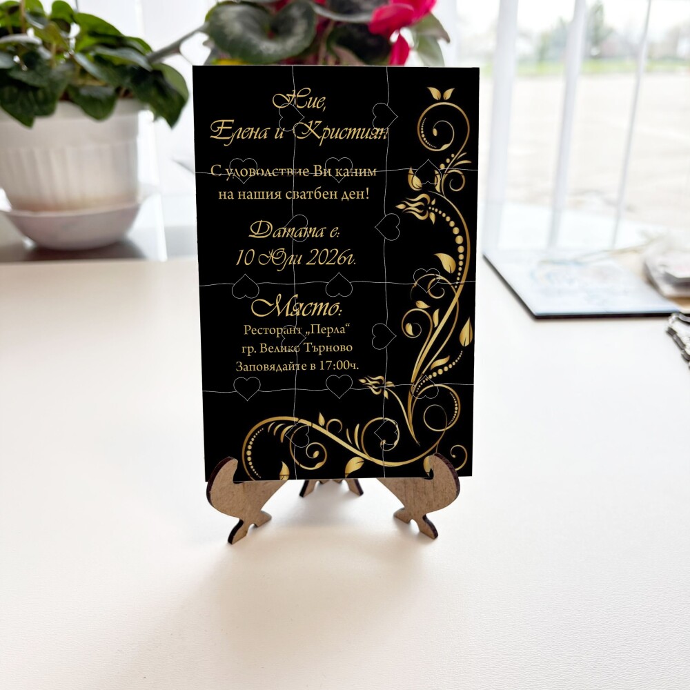 Пъзелът превръща поканата в изживяване – гостите сглобяват частите и разкриват вашето послание по уникален и запомнящ се начин.