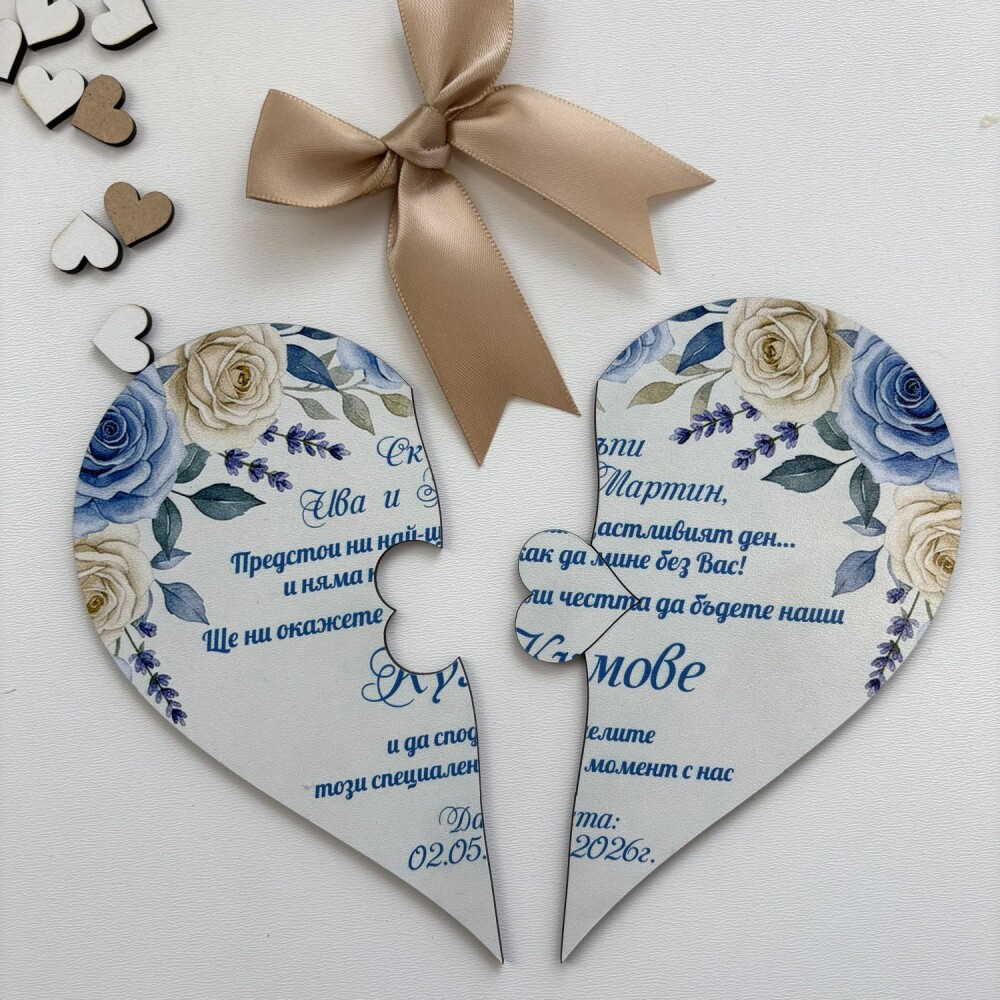 Дървена покана тип пъзел - Сърце за сватба 030