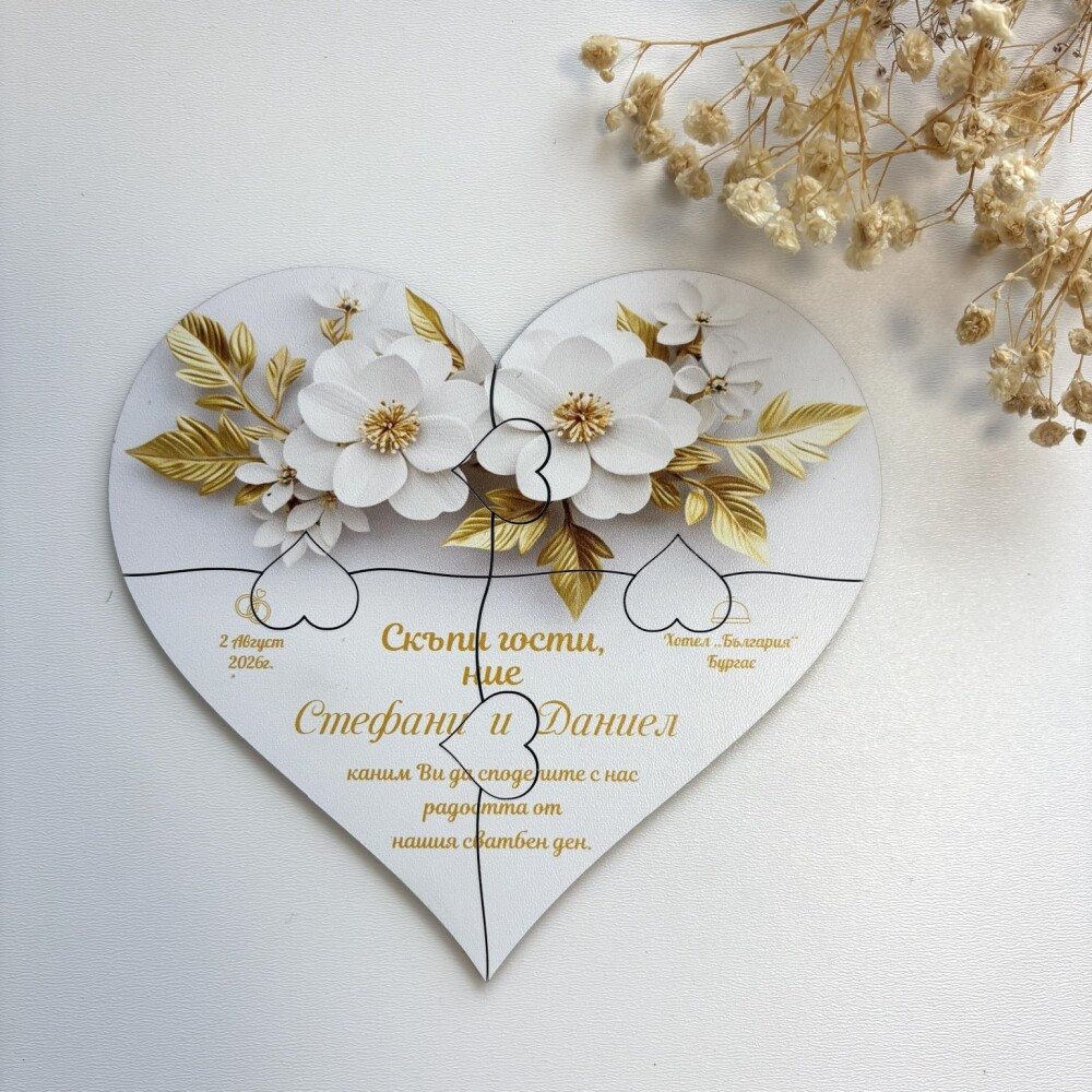 Пъзелът превръща поканата в изживяване – гостите сглобяват частите и разкриват вашето послание по уникален и запомнящ се начин.